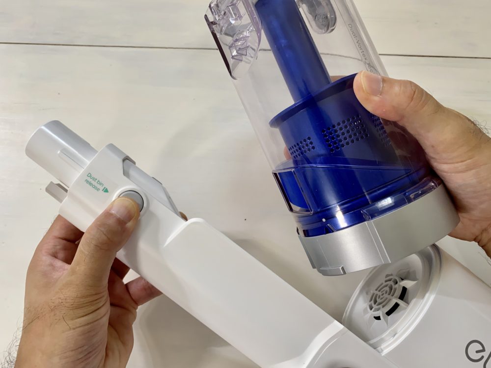 ▲ダストボックスの蓋はボタンを押すだけで開き、掃除機本体に装着したままでもゴミ捨てできますし、
